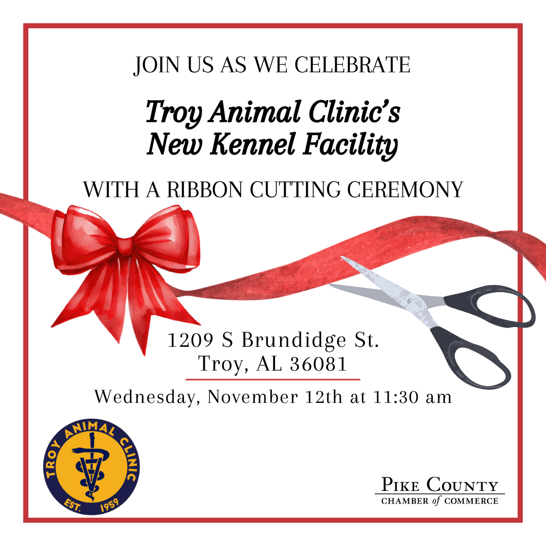 Join us as we celebrate Troy Animal Clinic’s new kennel facility and renovated lobby with a Ribbon Cutting Ceremony! 🐾✂️ Troy Animal Clinic is expanding its services with a brand-new kennel facility that will also offer doggy daycare! Along with these exciting additions, the clinic has given its lobby a fresh new look to better serve clients and their pets. Come help us celebrate these wonderful updates and see the new space for yourself!