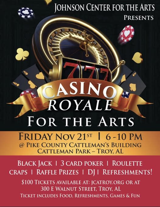 Johnson Center for the Arts presents: Casino Royale for the Arts. 'We are excited to announce our main annual fundraiser this year. It is a bit different than anything we've done before but we are ready to ROLL! This event will have entertainment, food, fun, and games. We will have prizes from some of the BEST local businesses and the food and entertainment will be TOP NOTCH. Mark your calendars today and invite your friends. This will be a night to remember!' You can purchase your tickets at: jcatroy.org Date: Friday, November 21st Time: 6-10 pm Where: Pike County Cattleman's BuildingImages