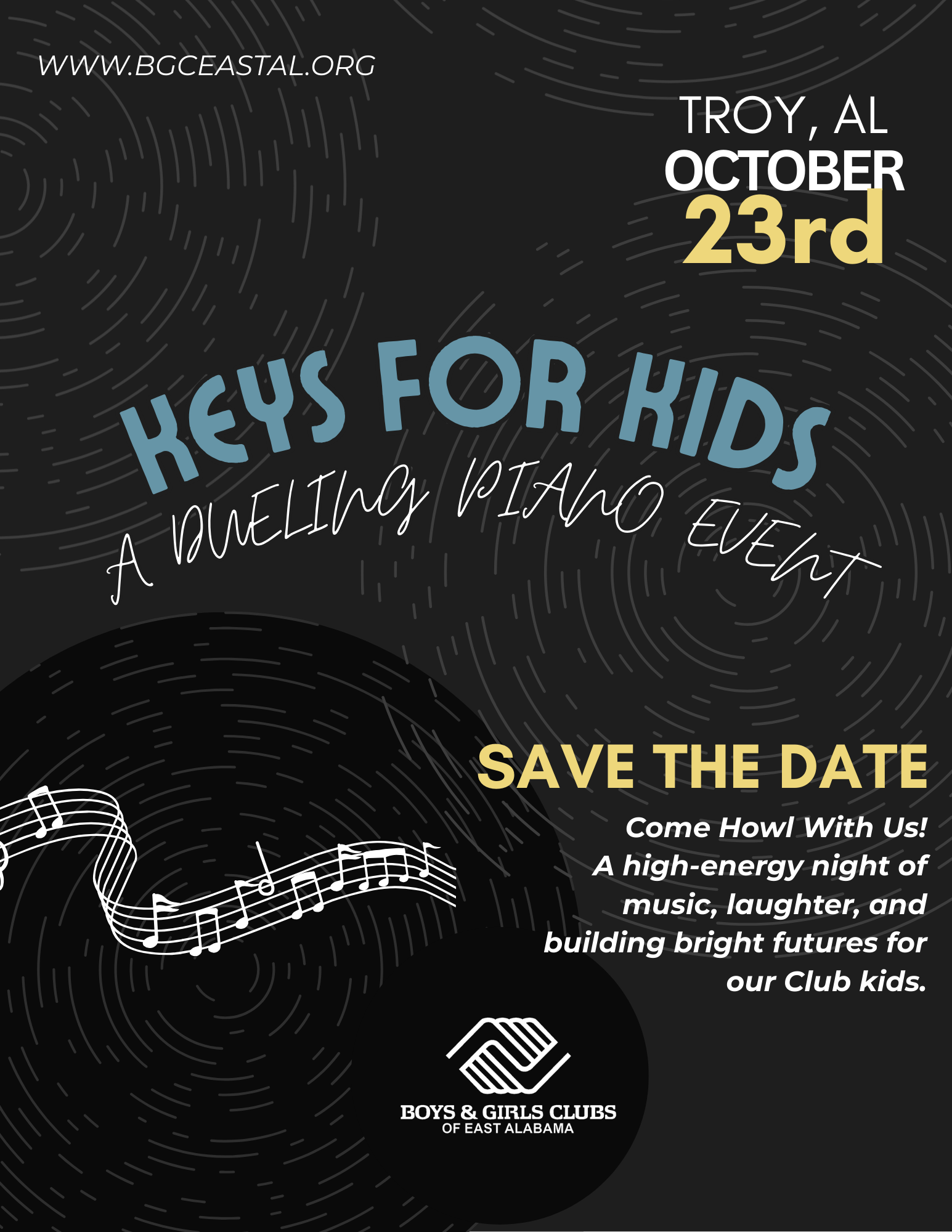 The Boys & Girls Club is turning up the energy to celebrate 15 incredible years in Pike County, and this time, the party is for the grown-ups. On Thursday, October 23, we’re inviting the community to The Social in downtown Troy for the inaugural Keys for Kids event; a 21-and-up night of music, laughter, and connection that fuels the mission of the Boys & Girls Clubs. In 2024, the Troy Clubhouse became part of the Boys & Girls Clubs of East Alabama family, ensuring that young people in Pike County have a safe, engaging place to explore their talents, set big goals, and build their own great futures. “Our future is brighter than ever,” said Richard B. Curry, Jr., President & CEO of Boys & Girls Clubs of East Alabama. “We have been quietly working behind the scenes to position the Boys & Girls Clubs for greater impact across Pike County. The momentum is real, and with young leaders like our 2025 Youth of the Year, Zyon N., a proud student at Charles Henderson High School, we are ready to show what’s possible when the community invests in the next generation.” The night begins with a special welcome from our Club members, but after that, it’s all about the adults. Picture two pianos, two outrageously talented entertainers, and you, the audience, choosing every song. From rock and roll classics to your favorite sing-alongs, the dueling pianos show is interactive, unpredictable, and unforgettable. Pair it with great drinks/small bites, good company, and the energy of Pike County’s hottest fundraiser, and you’ve got a date night or night out with friends you won’t soon forget. Every ticket sold and every dollar raised helps power the mission of the Boys & Girls Clubs, keeping our mission strong for the next generation of leaders, dreamers, and doers. When: Thursday, October 23, 2025 Where: The Social, Troy, AL For more info: www.bgceastal.orgImages